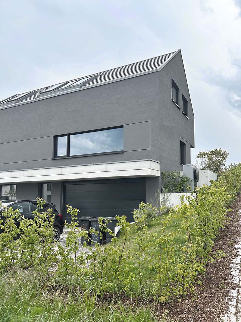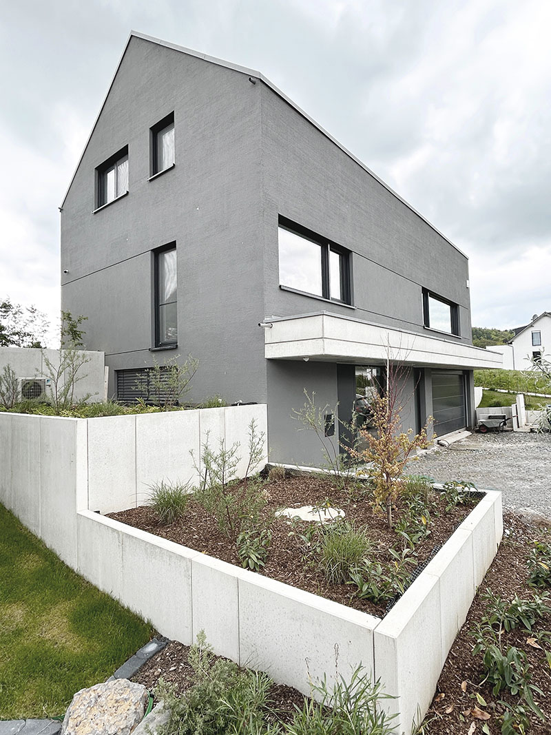 Das Haus ist als klares geometrisches Volumen mit Steildach in Massivbauweise mit Thermoziegeln erichtet. Ausnahme bildet der südlich eingeschobene überdachte Terrassenbereich vor dem Esszimmer. Die Architektur ist klar, zurückhaltend und modern. Die Fassade erhielt einen Außenputz mit horizontalem Besenstrich in einem warmen grauton. Prägendes Stilelement an der Eingangsfassade ist das durchgehende Vordach aus Sichtbeton, welches als Pflanztrog für Gräser dient. Die Außenlagen sind giebelseitig mittels L-Steinen abgetreppt, ansonsten klar und einfach begrünt.